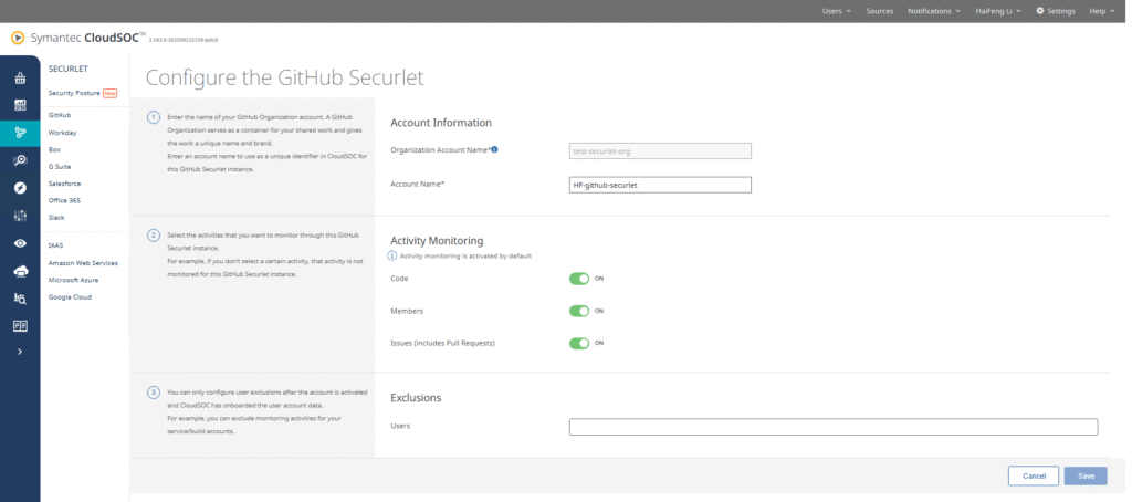 This guide describes how to configure the GitHub Securelet in Symantec CloudSOC, connect it with a GitHub organization account, and test the setup by creating a sample activity (such as an Issue) to trigger a policy violation notification.