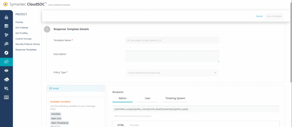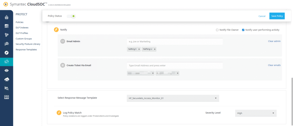 This ensures alerts can be automatically sent to admins, end users, and external ticketing systems. Don’t forget to reference this Response Template in the Policy configuration so that it will be applied correctly.