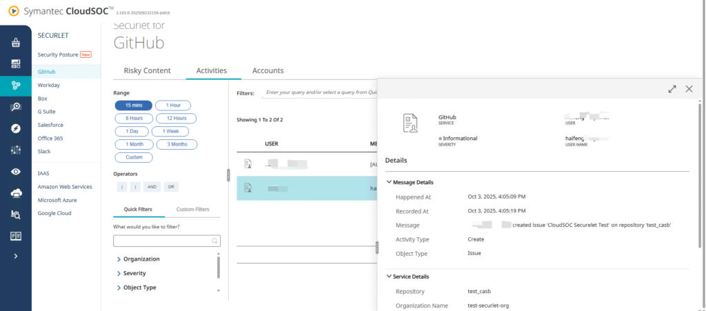 - In the CloudSOC console, go to Securlet → GitHub → Activities.