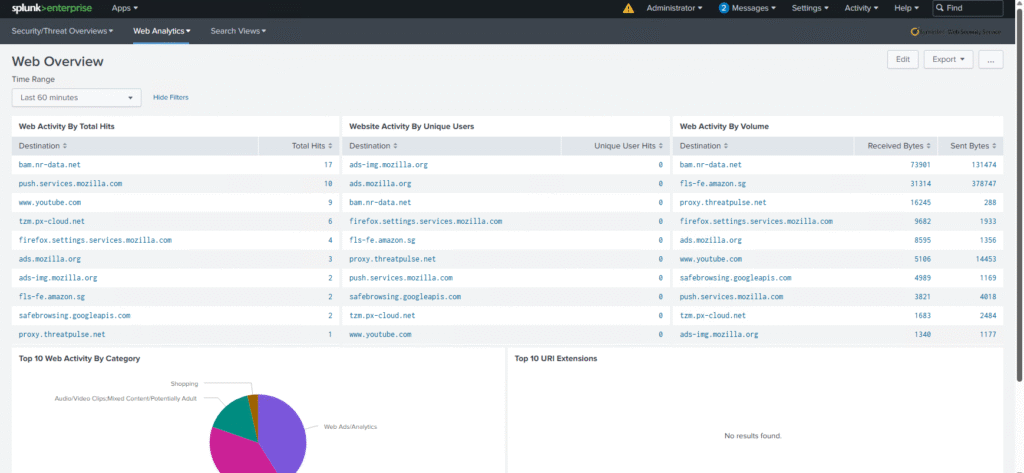 If results appear, dashboards such as Security Overview, Web Threat View, and Client View will populate.