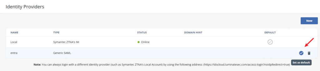 Note: You can always login with a different identity provider (such as Symantec ZTNA’s Local Account) by using the following address: (https://tenantname.luminatesec.com/accezz-login?noIdpRedirect=true)